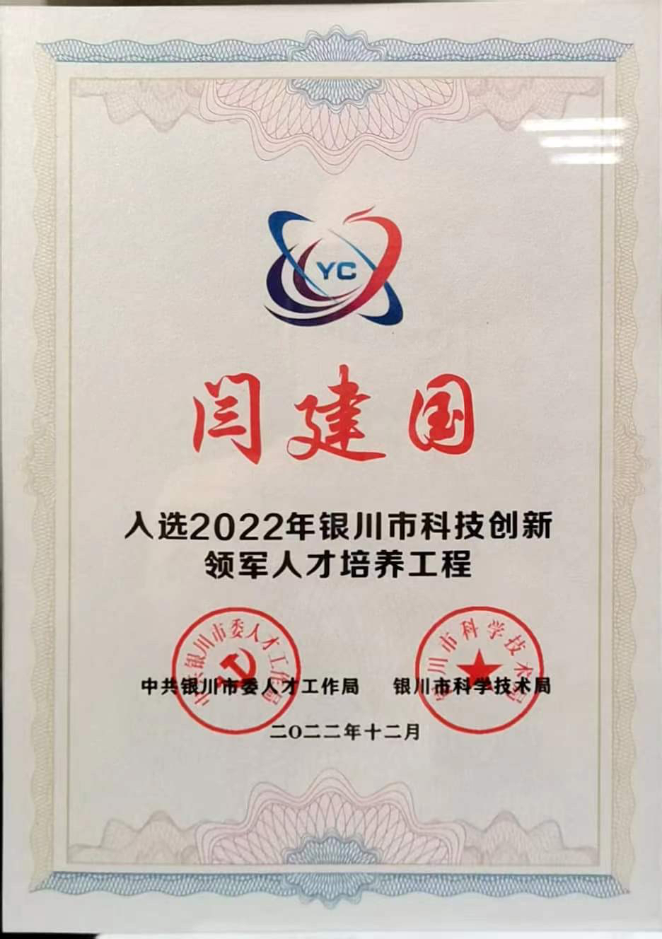 2022年12月被评为银川市科技创新领军人才