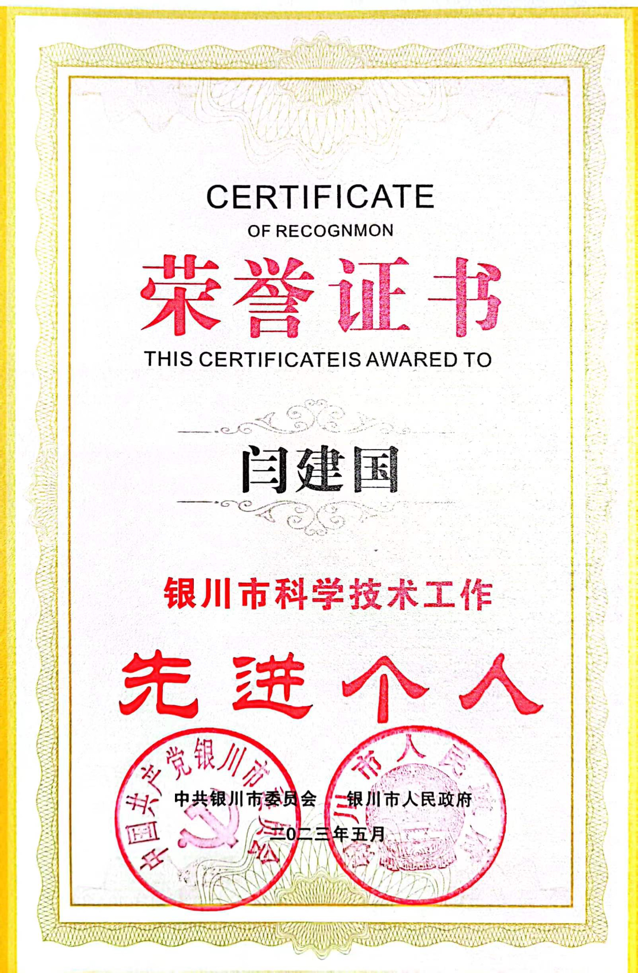 2023年5月被评为银川市科学技术工作先进个人